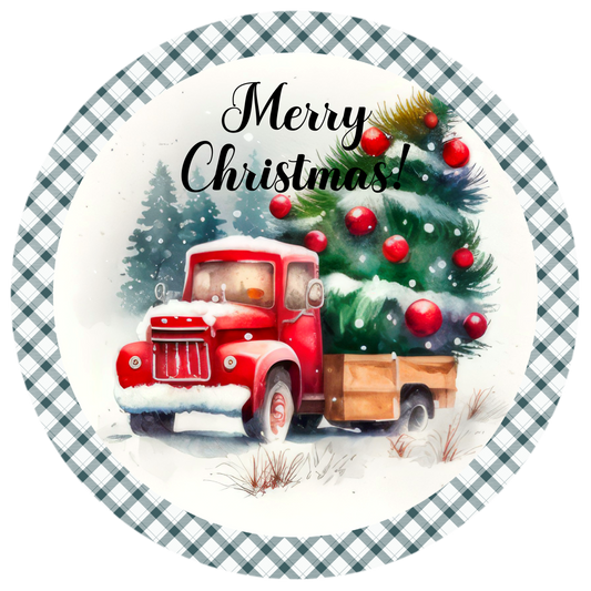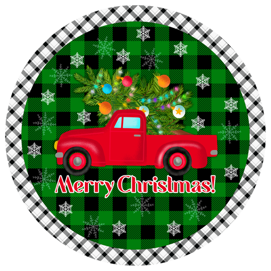 "Merry Christmas" Red Truck Wreath Sign - Festive Holiday Decor - Buffalo Plaid Background - 6”, 8”, 10" or 11.75" Round