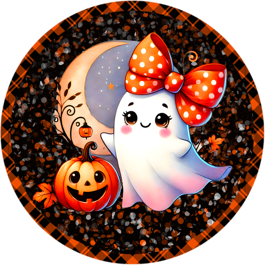 Adorable Ghost with Pumpkin Round Wreath Sign - Cute Halloween Decor - Spooky Season Decoration