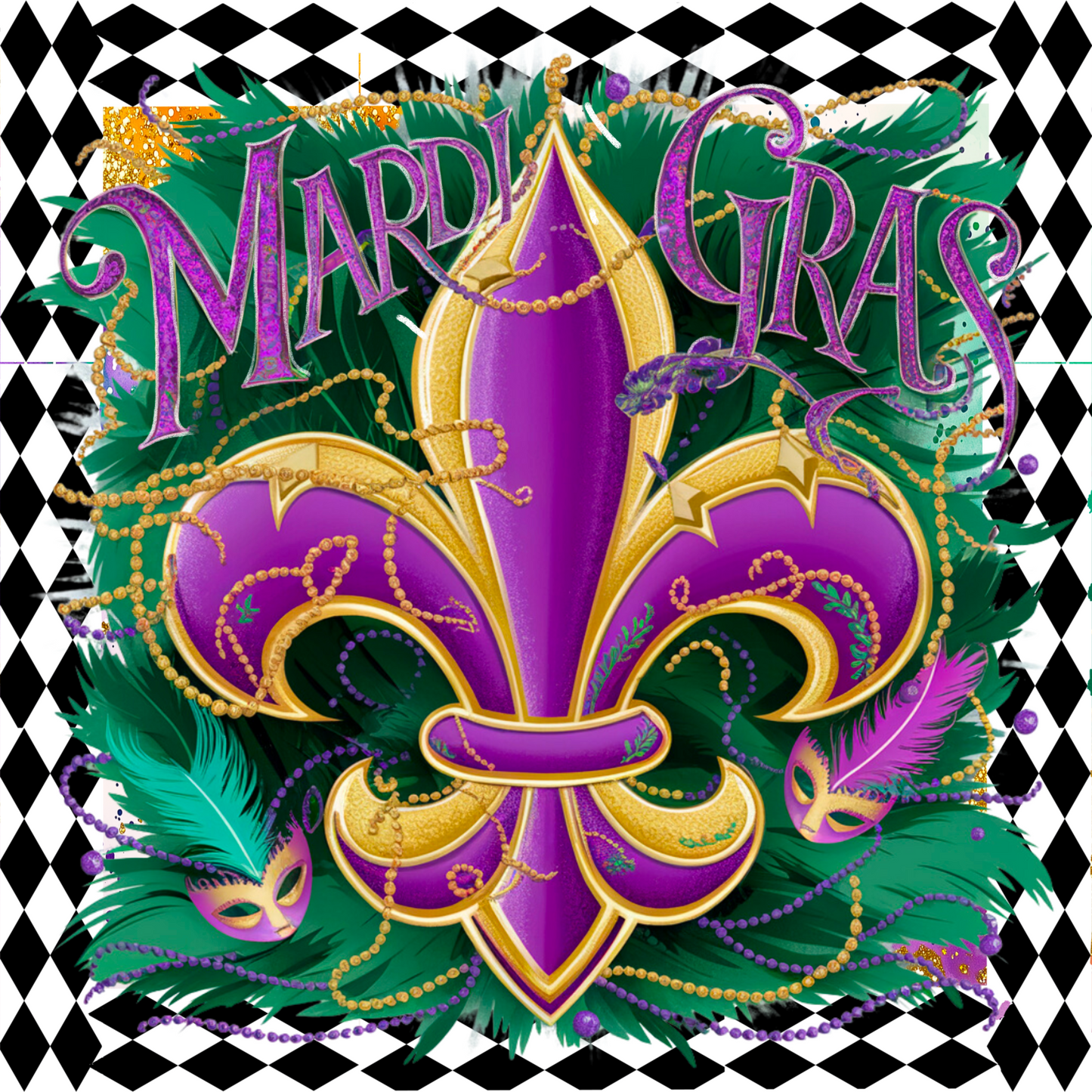 Make a statement this Mardi Gras with this bold Fleur-de-Lis wreath sign, custom-designed by Terri Marshall of MilandDil Designs! This 10" square piece features a striking purple and gold Fleur-de-Lis surrounded by vibrant green feathers, sparkling beads, and festive Mardi Gras masks. The bold "Mardi Gras" text and harlequin border complete the design, making it the perfect decor piece for your Carnival celebrations.