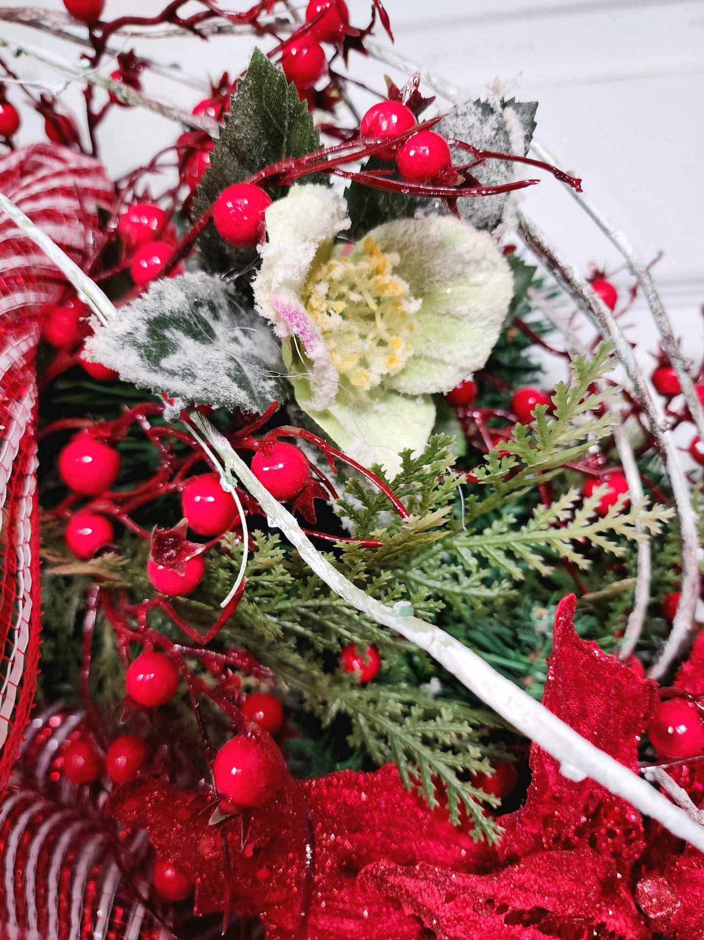 A large designer bow crafted from premium ribbons in red, white, green, and black adds a bold, festive touch to this one-of-a-kind piece. Designed to make a statement, this wreath is perfect for your front door, mantel, or wall, spreading joy to everyone who sees it.