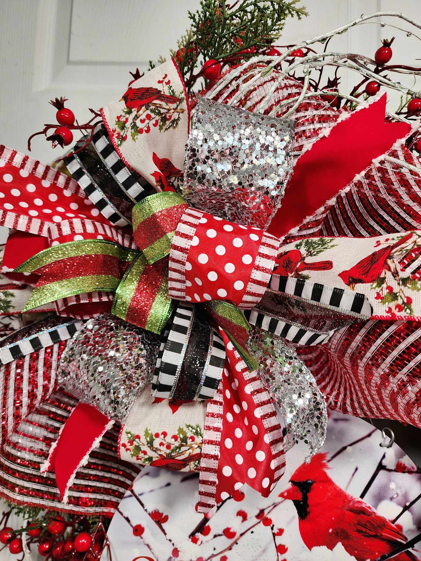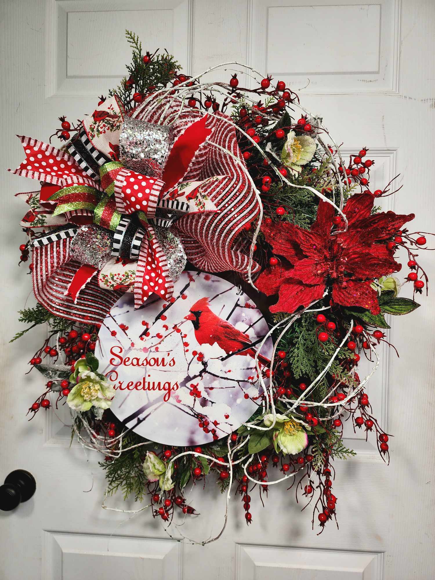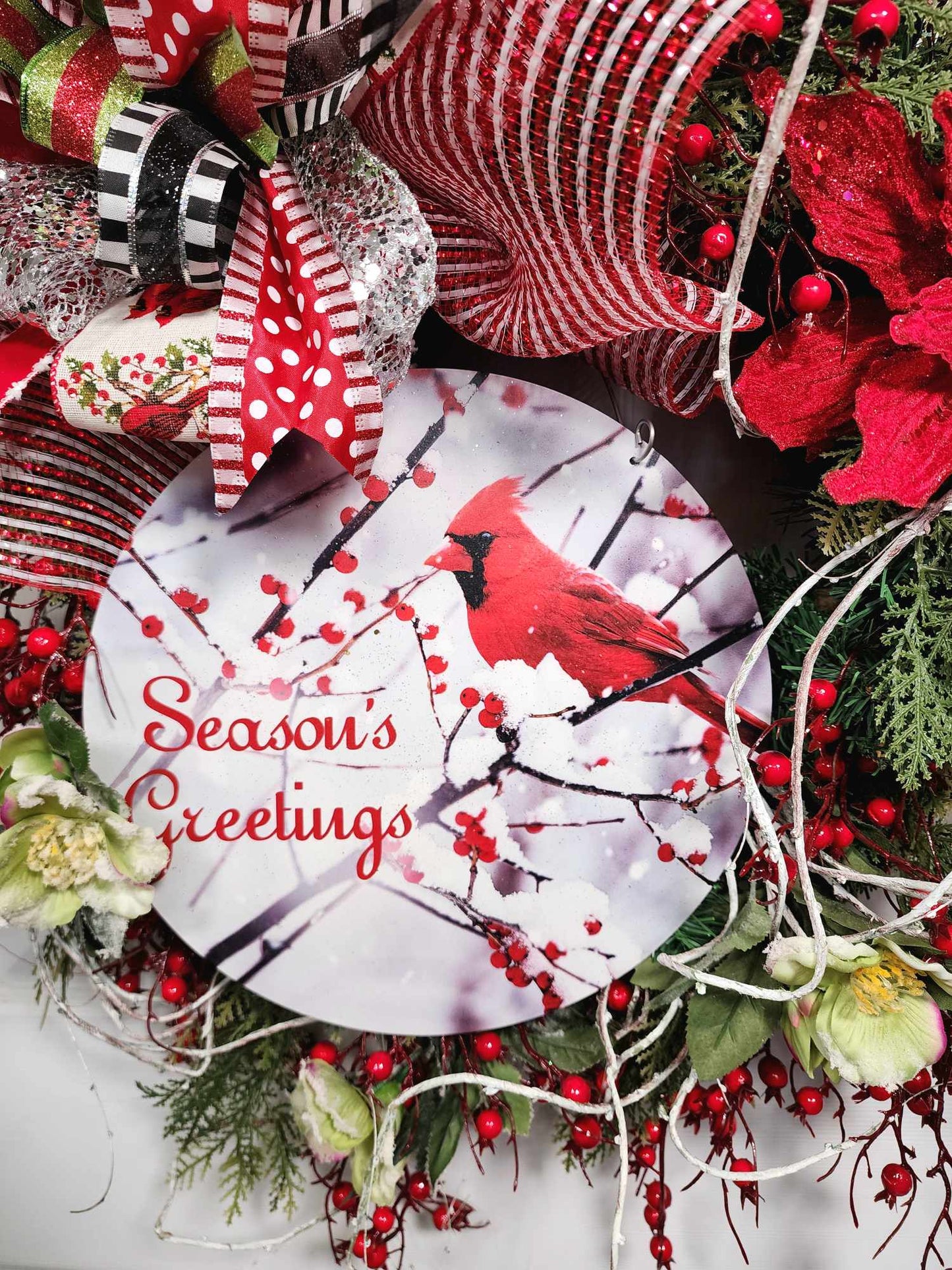 Cardinal Season's Greetings Christmas Wreath – Festive Red & White Winter Décor with Designer Ribbon & Holiday Accents