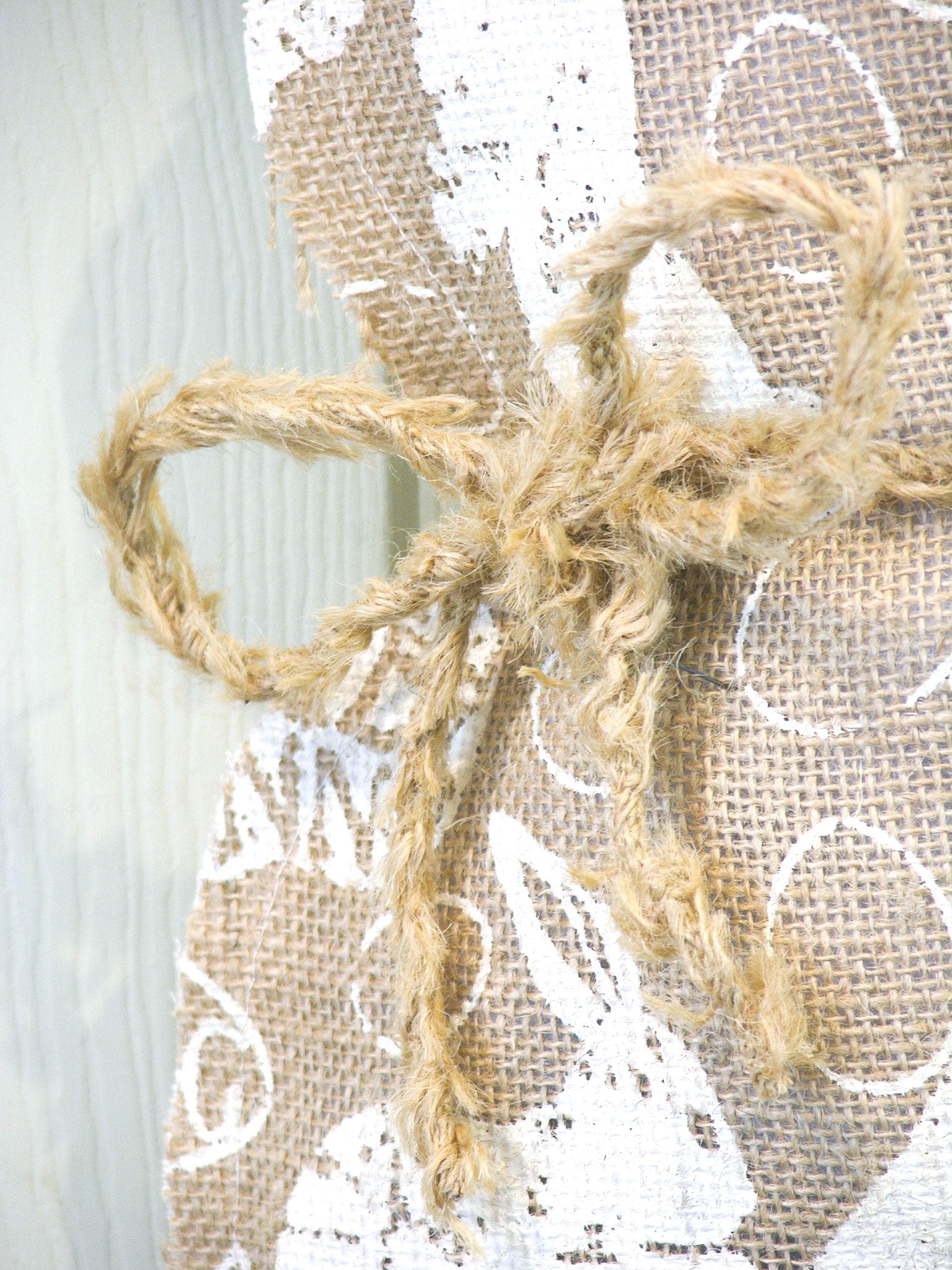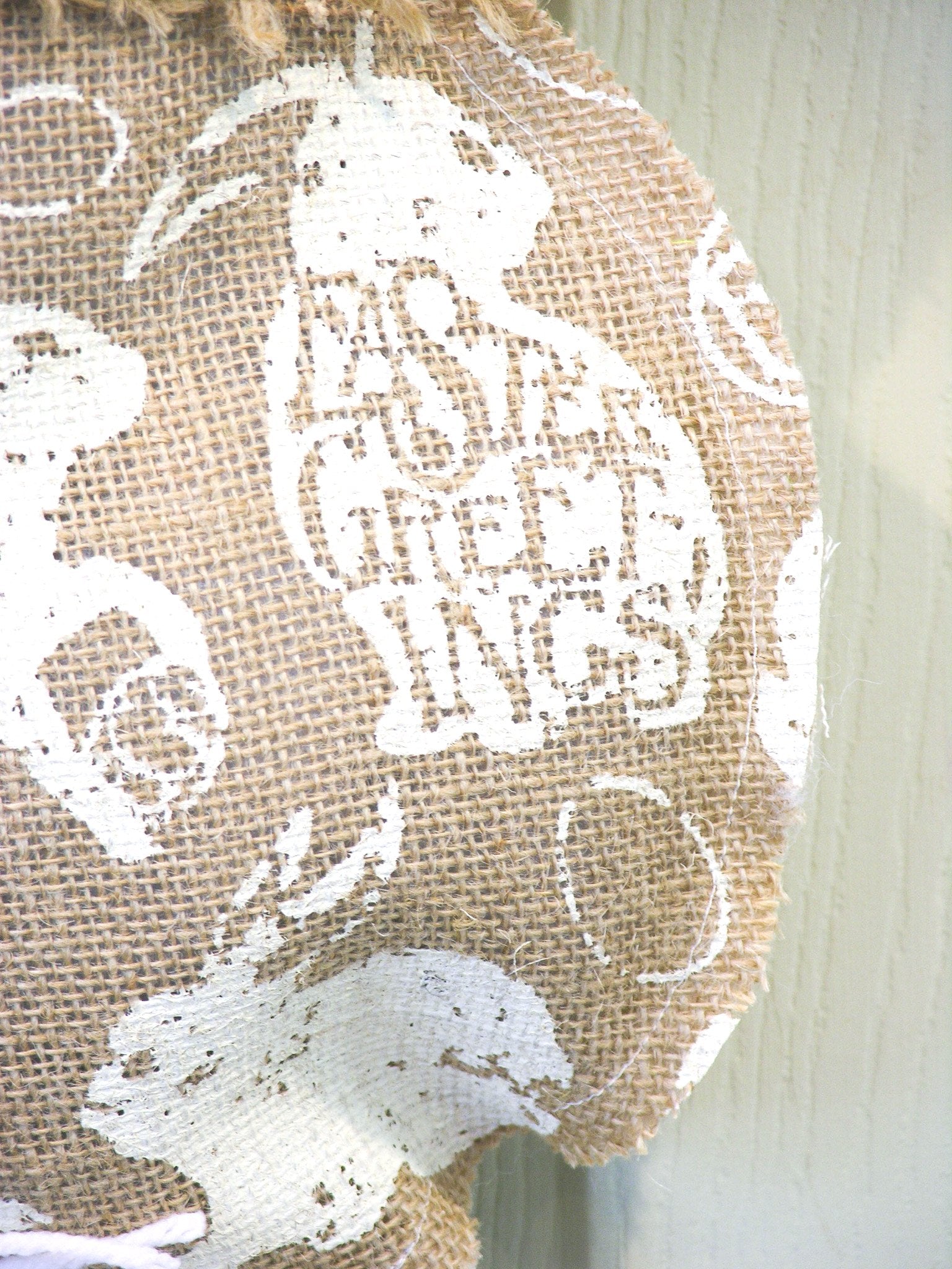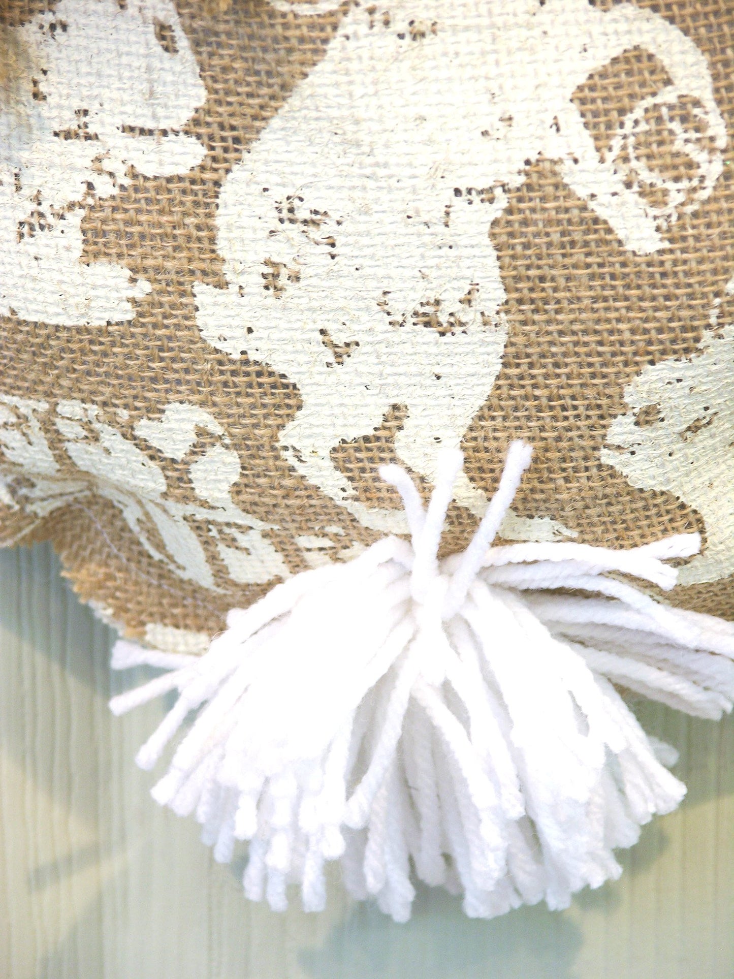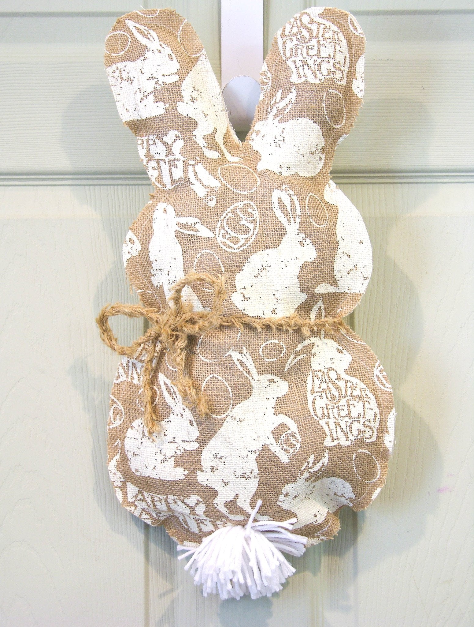 This Easter Greetings Bunny Hanger is perfect to add a touch of whimsy and fun to your decor. It features white bunnies of different shapes printed on burlap, with Easter greetings messages. It's tied with a burlap fringed rope and white tail, and can be used alone or as an attachment to a wreath. Measuring 19"H x 11"W, it's sure to bring a smile to everyone who sees it.