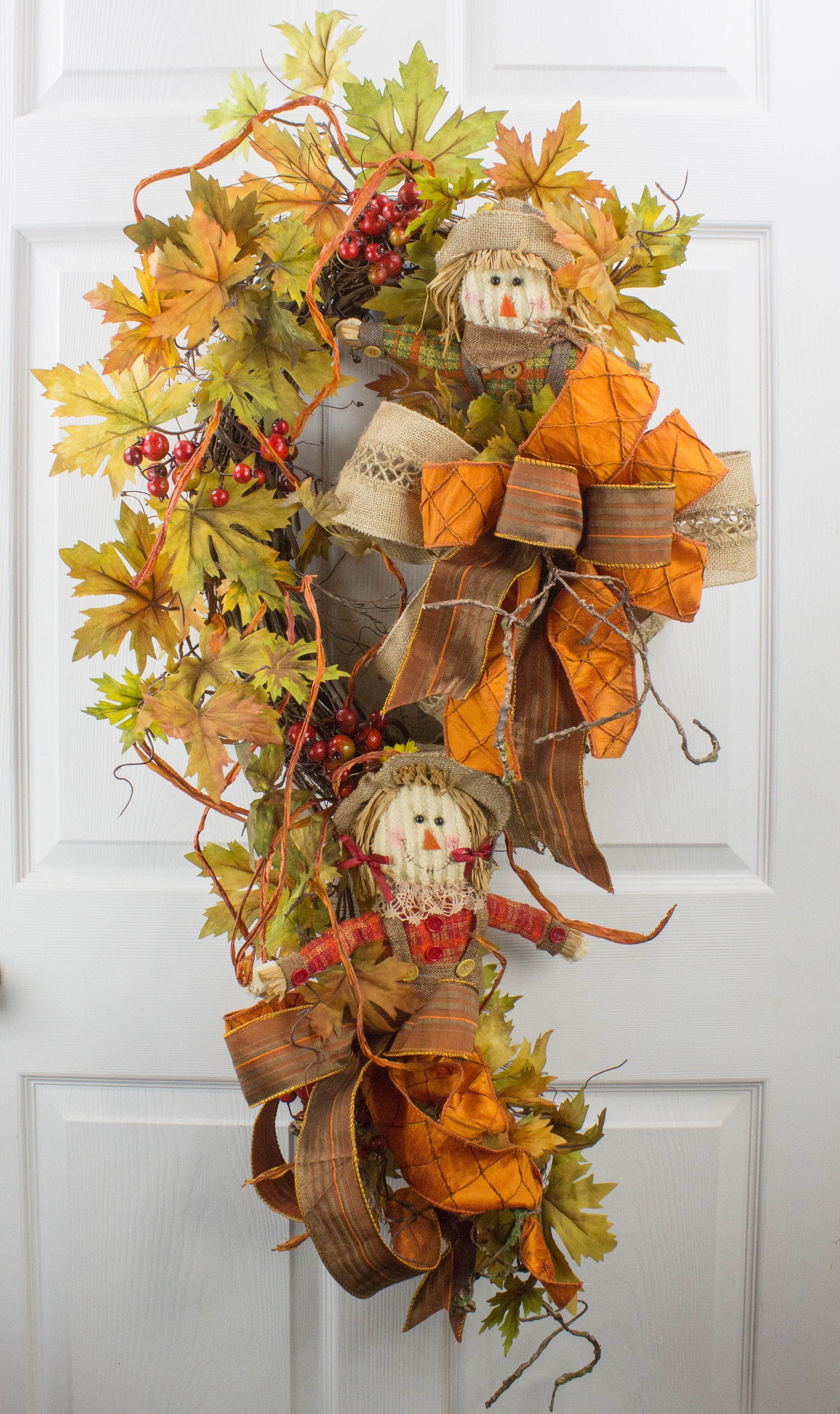 Autumn Scarecrow Door Swag with Orange Bows and Berry Accents - Fall Harvest Decor