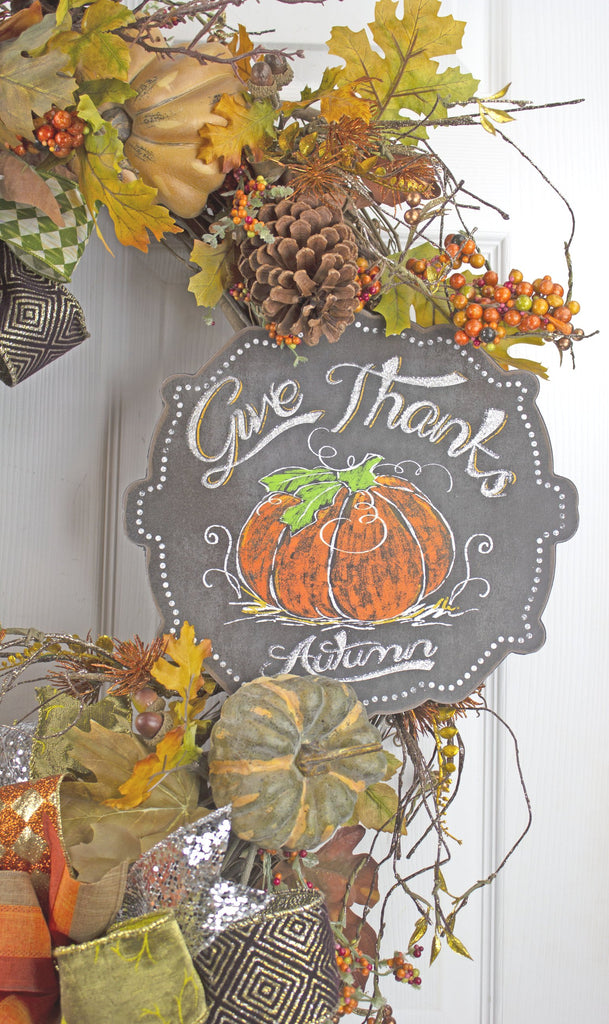 - **Design:** Features a 12-inch chalkboard sign with "Give Thanks" and "Autumn" in glitter, surrounded by festive autumn elements