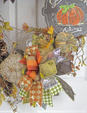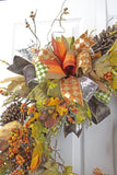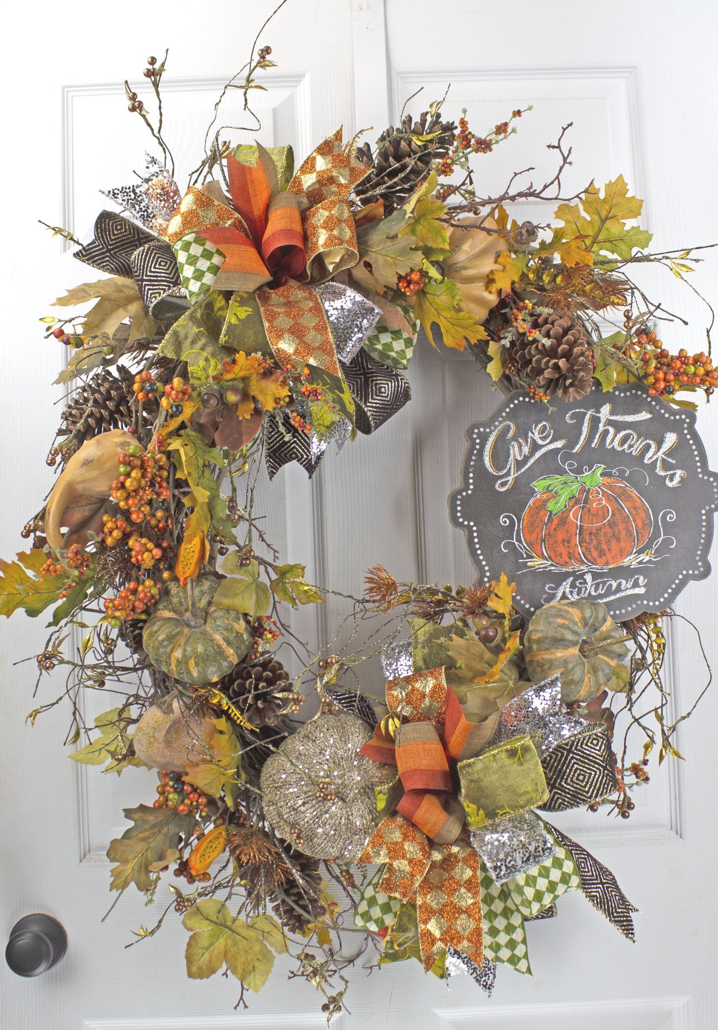 Give Thanks Autumn Wreath with Pumpkins, Pinecones, and Fall Bows - Thanksgiving Door Decor
