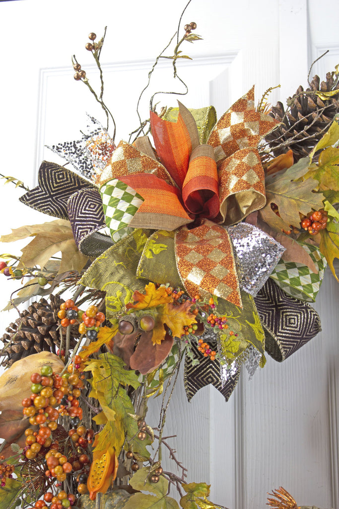 - **Materials:** Grapevine base, glittered pumpkins, gourds, fall leaves, pine cones, berries, glittered vines, chalkboard sign, premium ribbons