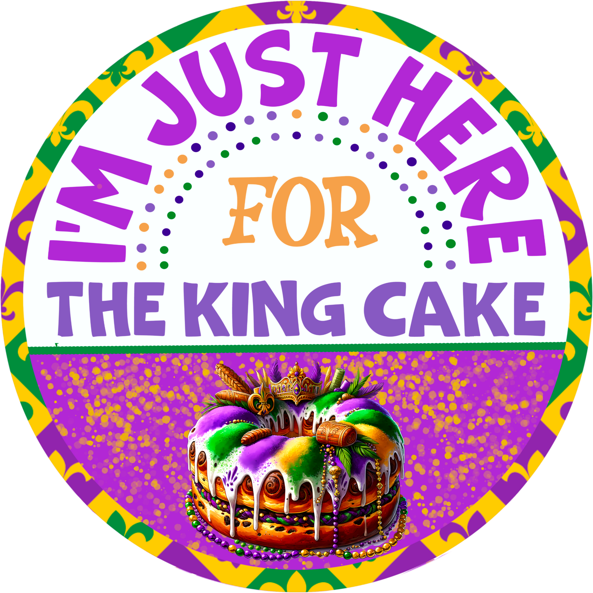 Add a sweet touch to your Mardi Gras celebrations with this “I’m Just Here for the King Cake” metal sign! Perfect for King Cake lovers, this vibrant sublimated design features a beautifully illustrated King Cake surrounded by festive purple, green, and gold accents. Available in 6", 8", 10” and 11.75” round sizes, it’s a playful addition to your Mardi Gras decor or a unique gift for anyone who loves this cherished tradition.