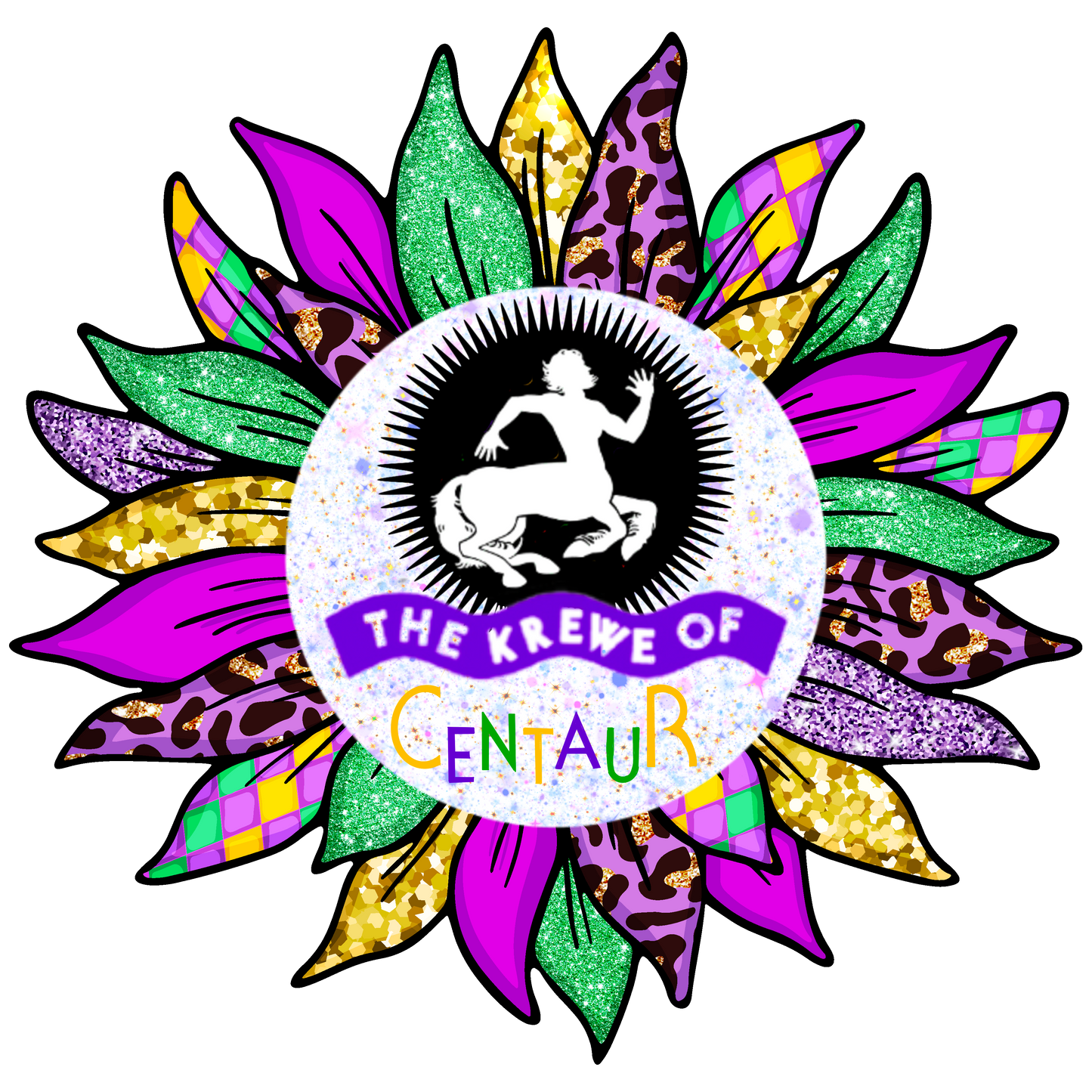 - Festive Design: Incorporates the Krewe of Centaur logo with sparkling Mardi Gras colors and bold patterns.