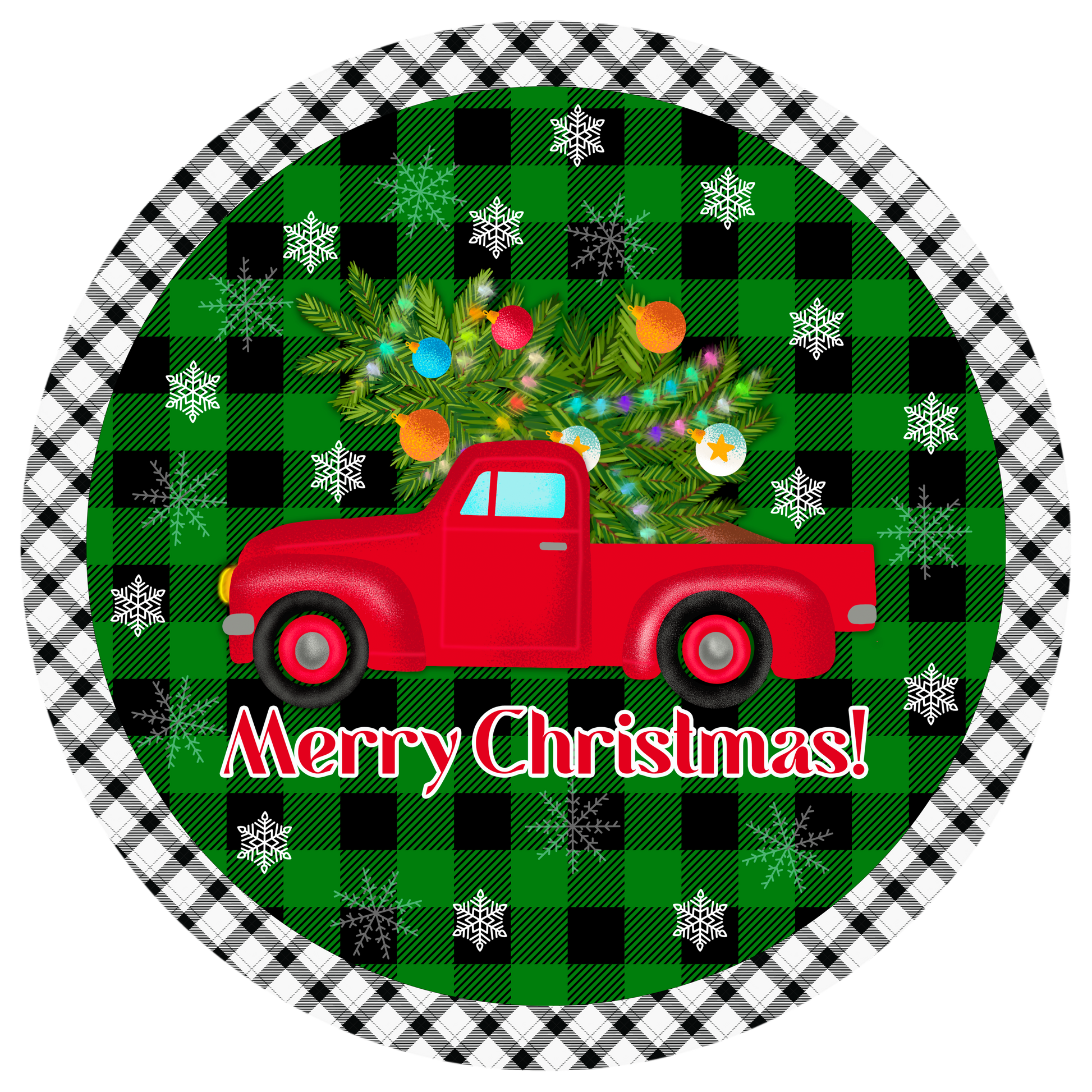 "Merry Christmas" Red Truck Wreath Sign - Festive Holiday Decor - Buffalo Plaid Background - 6”, 8”, 10" or 11.75" Round