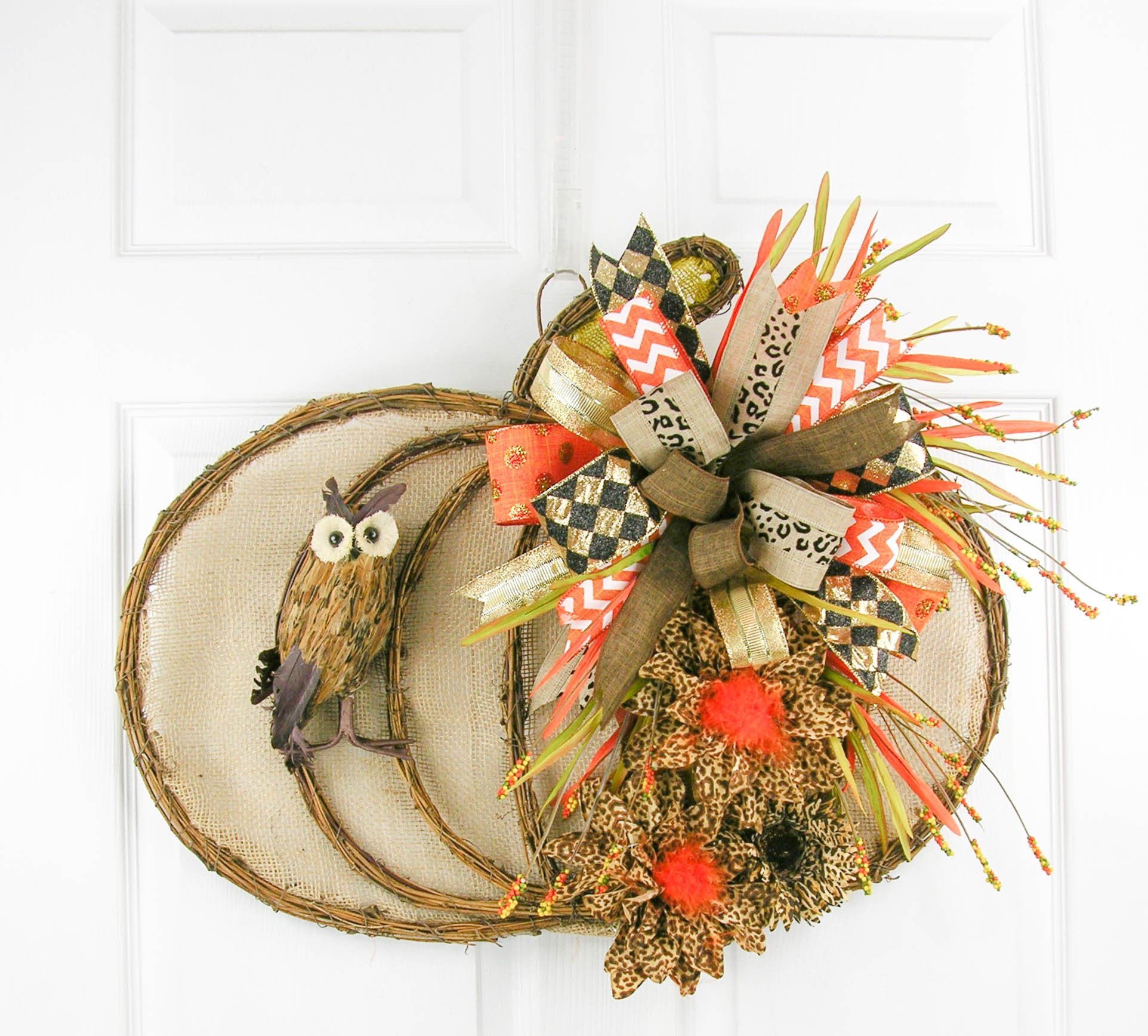 Autumn Owl Grapevine Pumpkin Door Hanger with Fall Bows and Leopard Accents