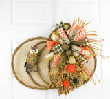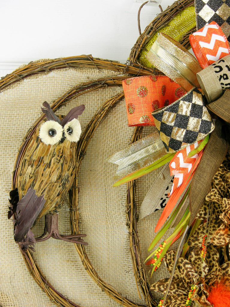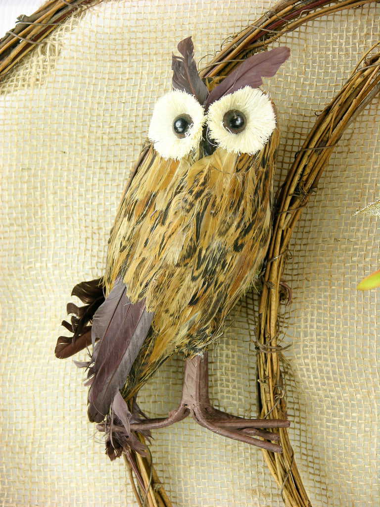 - **Materials:** Grapevine base, artificial owl, premium ribbons, and autumnal accents