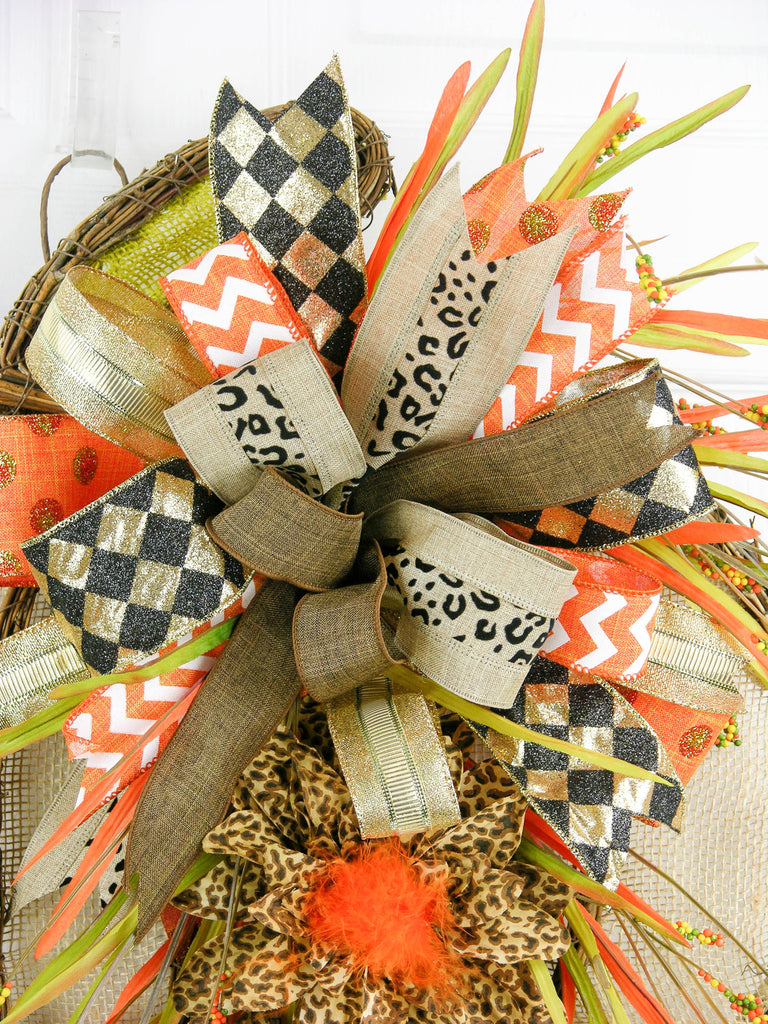 Crafted from a sturdy grapevine base shaped like a pumpkin, this door hanger features a charming owl perched on one side, bringing a touch of woodland magic to your home. The arrangement is adorned with vibrant fall bows in rich oranges, browns, and golds, along with playful chevron and leopard print ribbons. Accents of autumnal foliage and decorative elements complete the look, capturing the essence of the harvest season.
