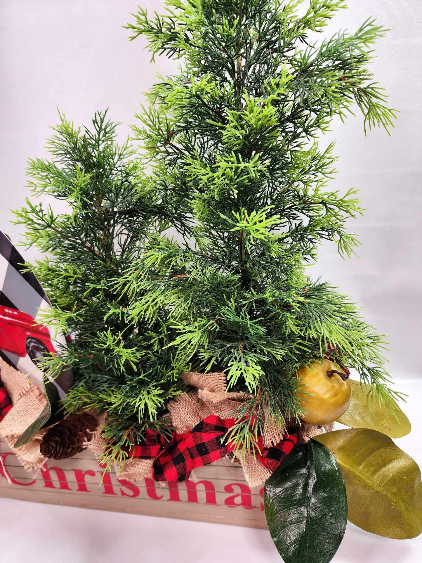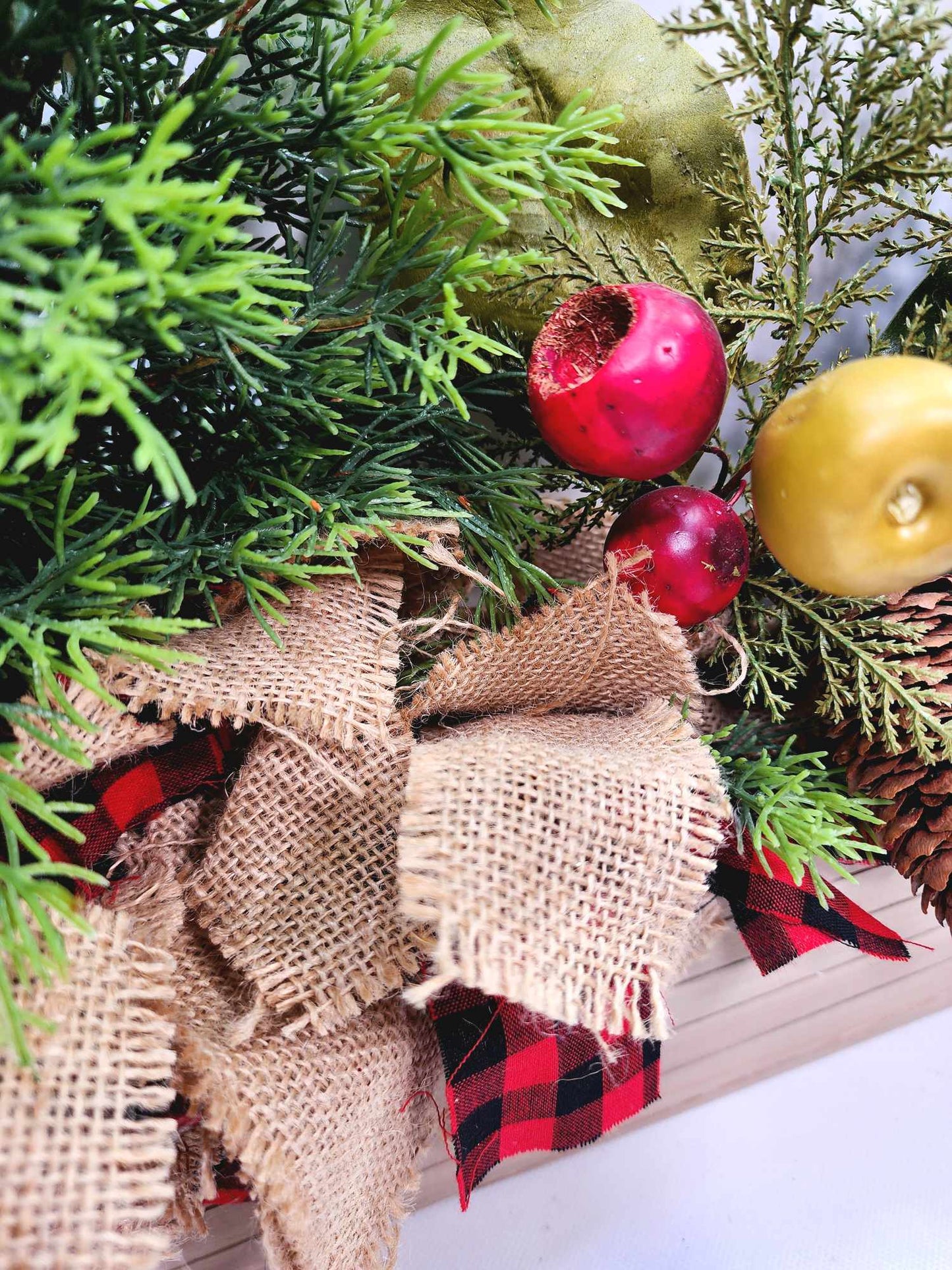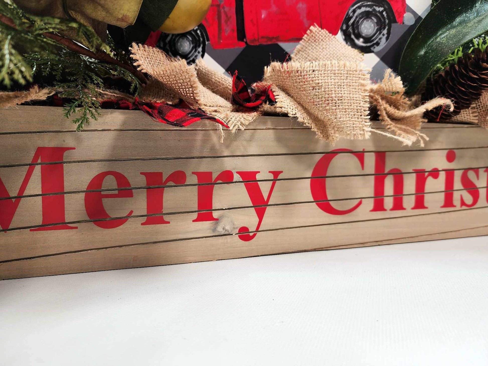 Burlap accent ribbons and buffalo plaid bows add a touch of rustic elegance, while the arrangement sits in a charming wooden box featuring the words "Merry Christmas." This timeless piece is designed to complement any farmhouse or rustic décor style.