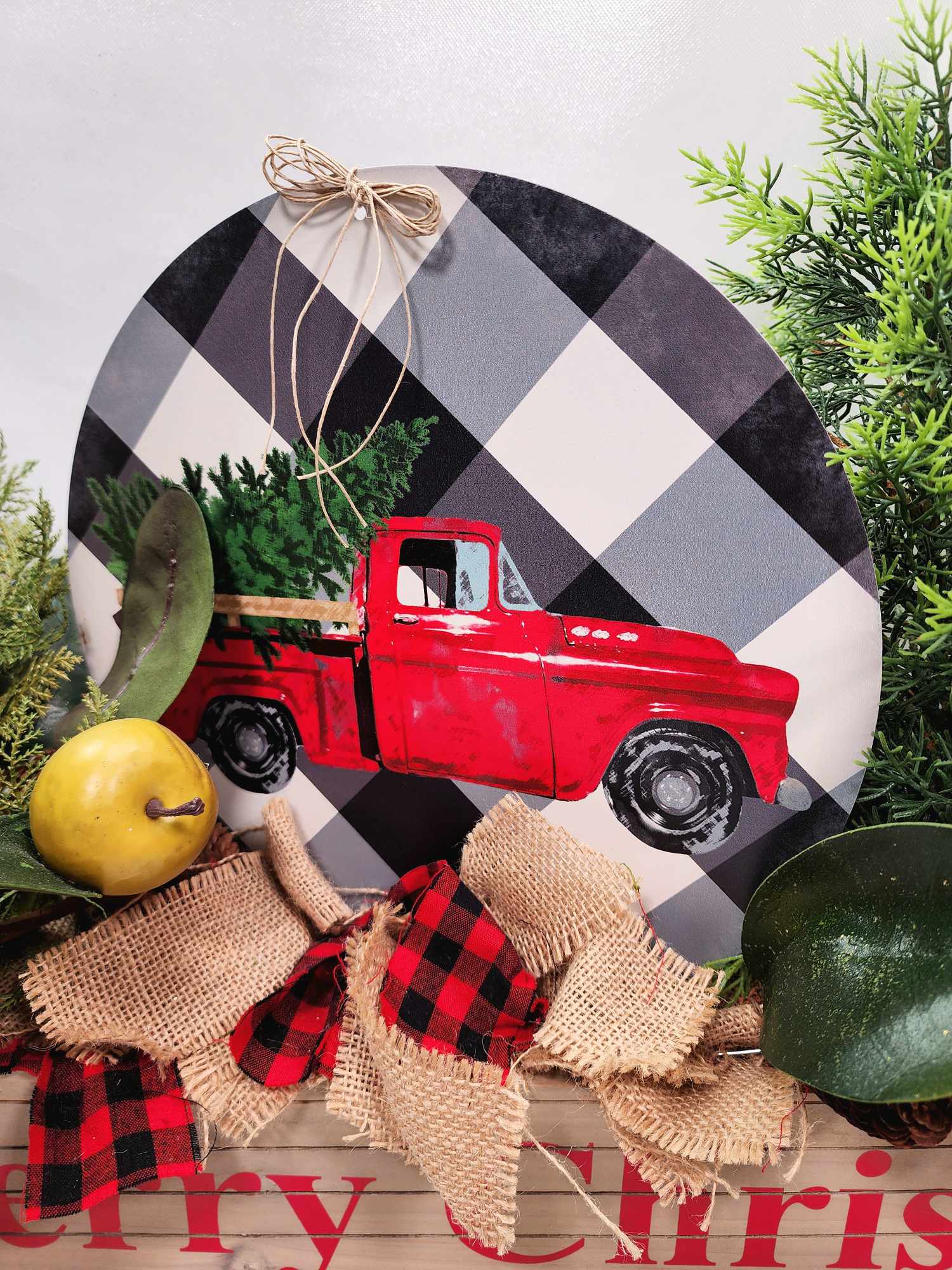 - 12" metal sublimated red truck sign with buffalo plaid design