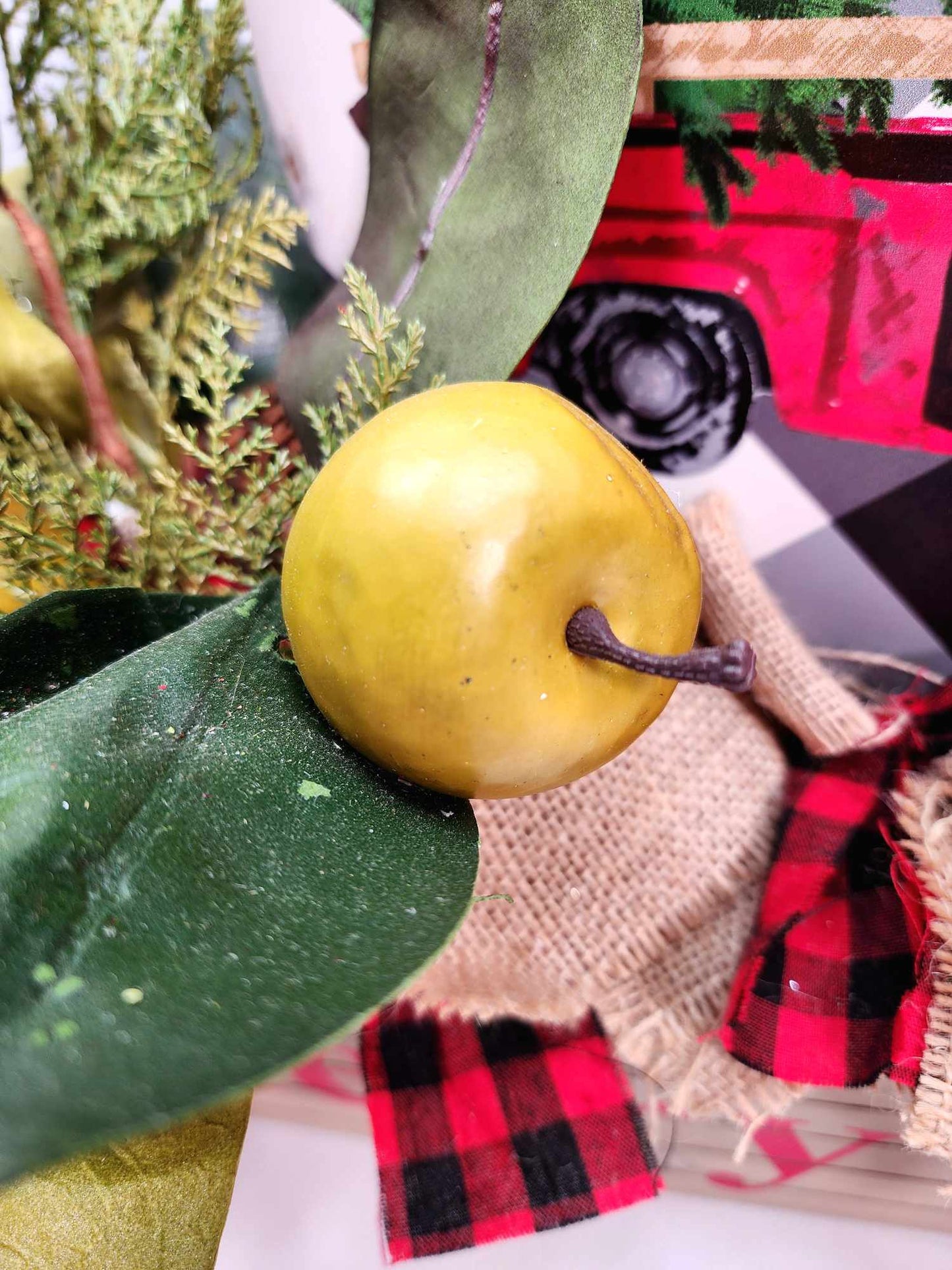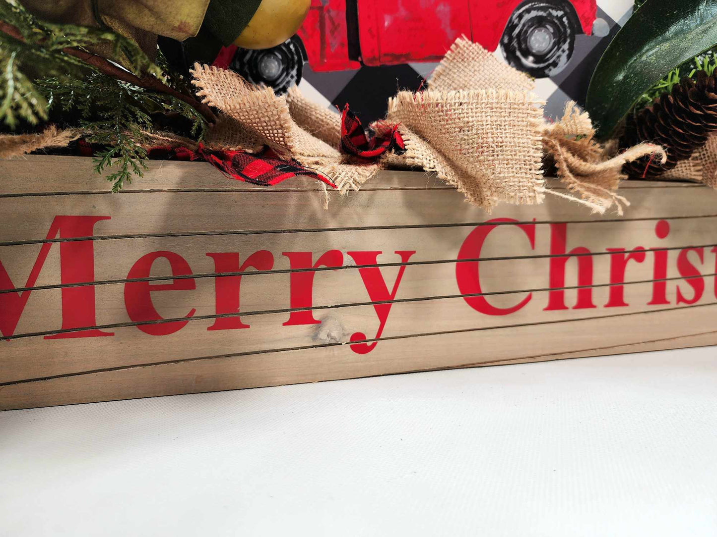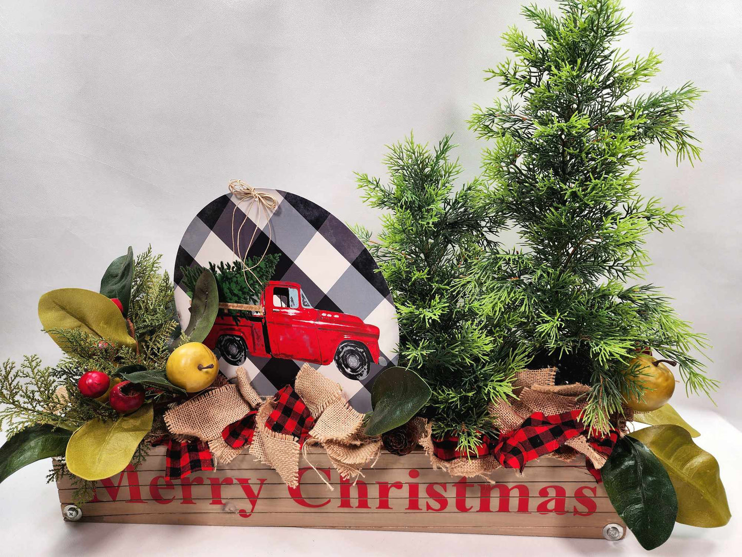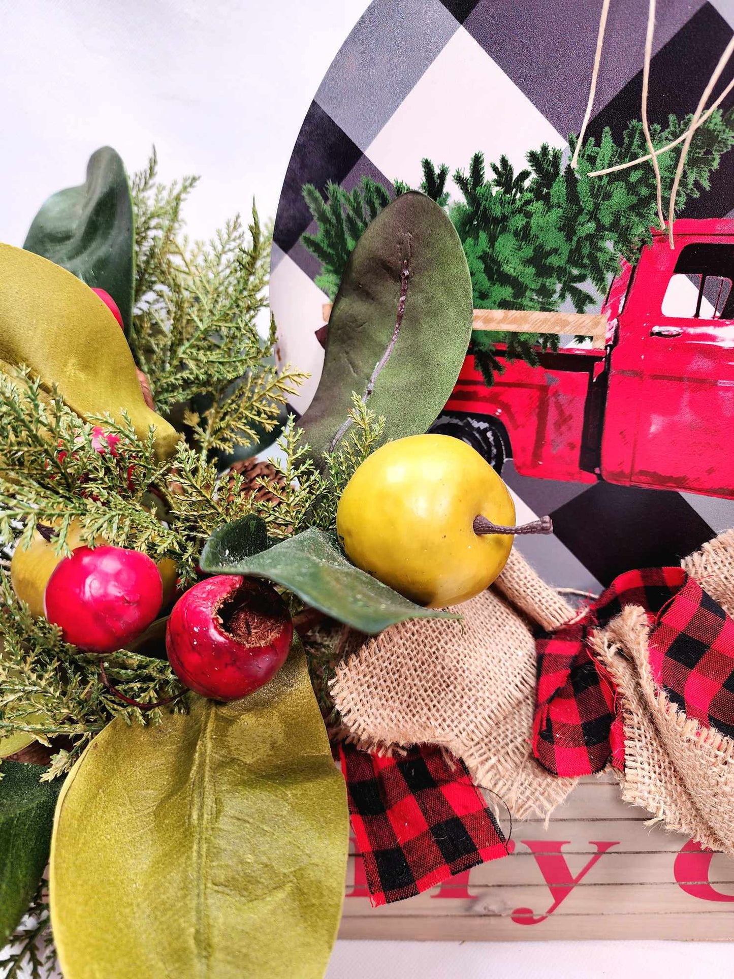 At the heart of this arrangement is a 12" metal sublimated sign featuring a vibrant red truck carrying a festive Christmas tree, set against a stylish buffalo plaid background. Surrounding the sign are lush faux magnolia leaves, eucalyptus berries, bright red berries, and small evergreen trees, creating a natural and cozy holiday aesthetic.