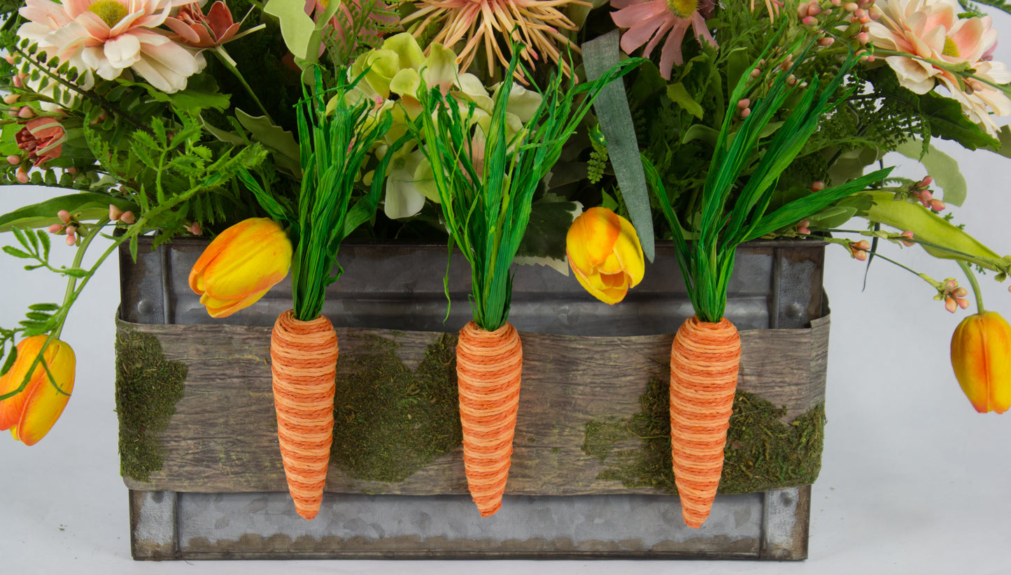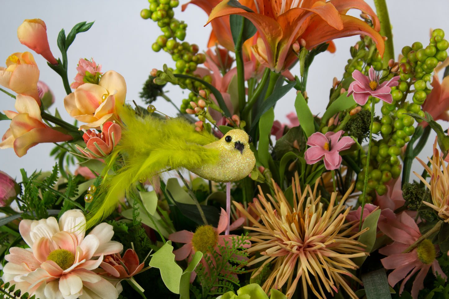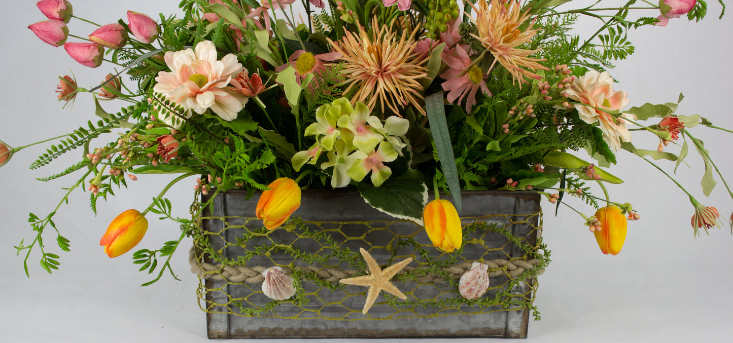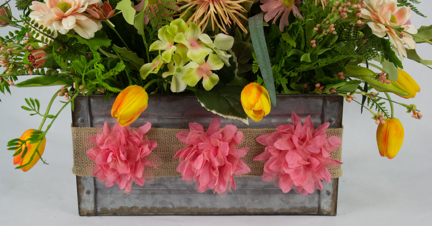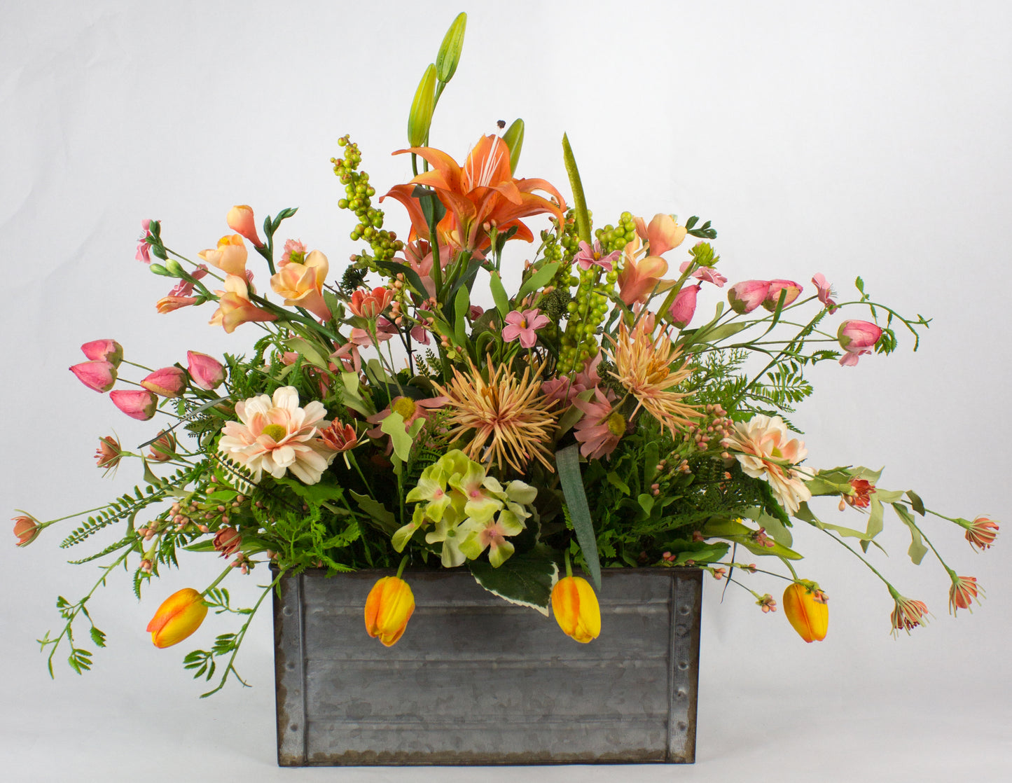 What happens when you pair a beautiful Spring and Summer arrangement in a metal container WITH interchangeable seasonal bands??? Well magic happens.