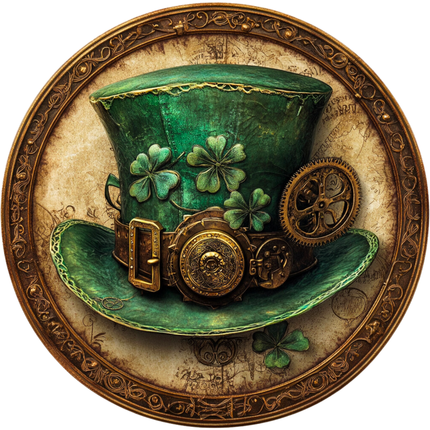Steampunk St. Patrick's Day Wreath Sign – Clover Hat Design – Round Metal Decor