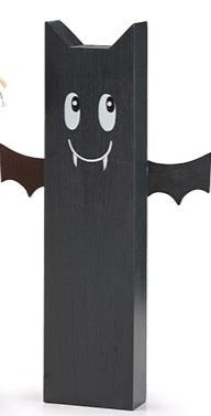 Varied set of halloween wood post characters: Smiling black bat, mummy wraped in linen strips, a jack--lantern with a raffia bow, a skeleton with a black raffia bow tie, and Frankenstein with bolts stick out of his head.